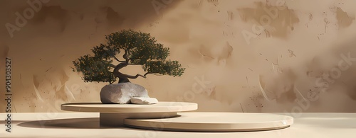 Japanese style minimal abstract background - stone podium and bonsai tree with brown background for prWall mural