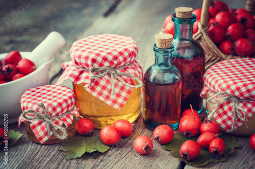 Wall mural : Jars of honey, tincture bottles and mortar of hawthorn berries o