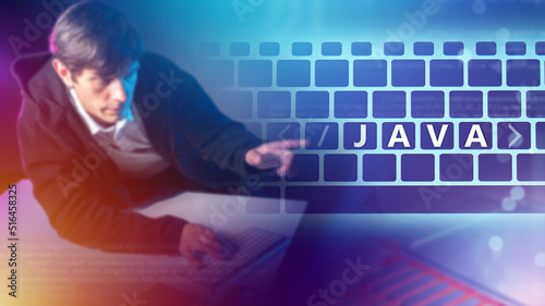 Wall mural java logo next to programmer. software developer points to letters java. javascript programming lang - Wall murals Wall mural java logo next to programmer. software developer points to letters java. javascript programming lang - Wall murals
