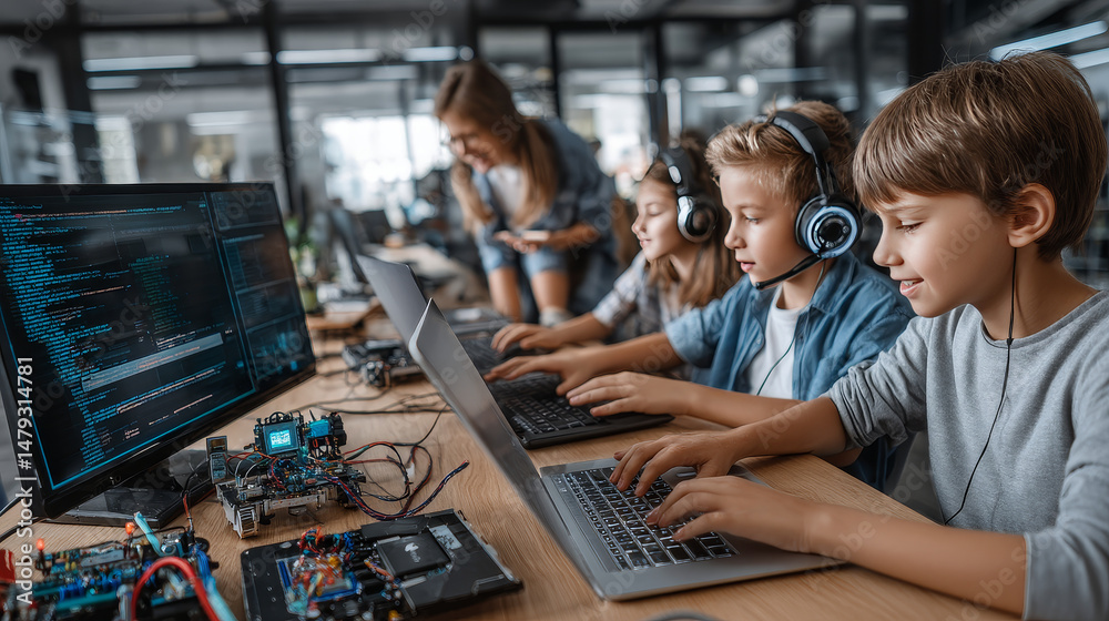 Wall mural kids learning to coding, programming in online it school. engineering courses in internet for talent - Wall murals Wall mural kids learning to coding, programming in online it school. engineering courses in internet for talent - Wall murals