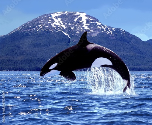 The watermark will not be included on Wall mural.: Killer whale, orcinus orca, adult leaping, canada