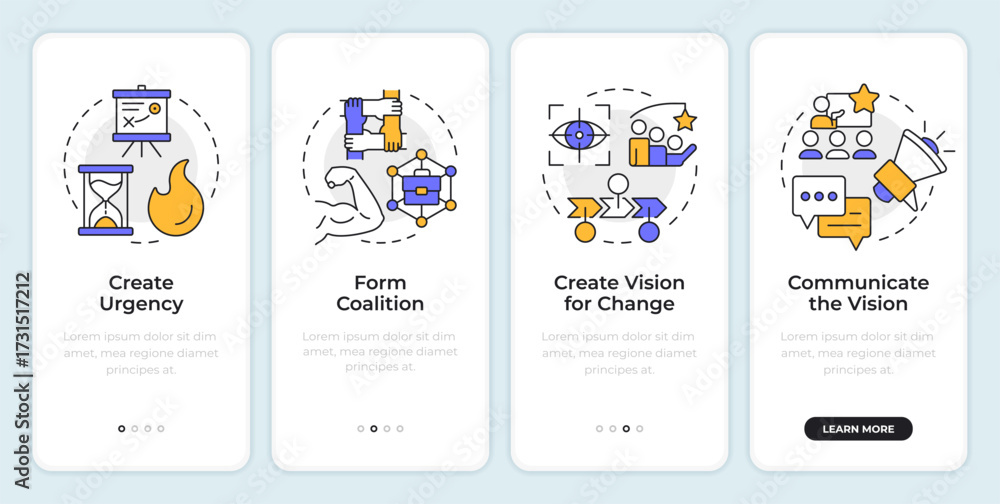 Wall mural : Kotter change management model onboarding mobile app screen - corporate - walkthrough 4 steps editable