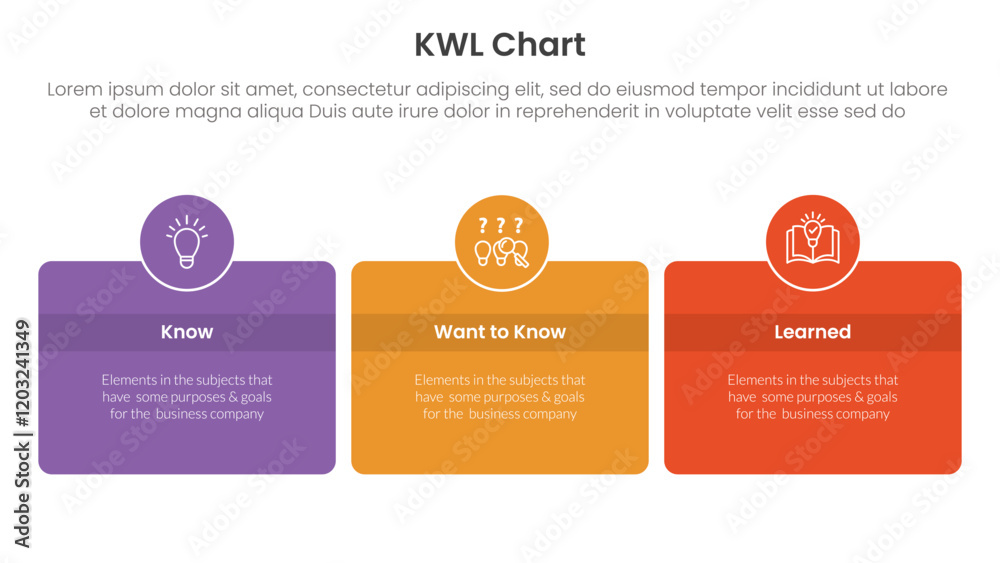 The watermark will not be included on Wall mural.: Kwl chart infographic 3 point with round box and circle badge on center with horizontal direction fo