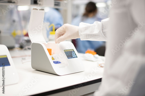 The watermark will not be included on Wall mural.: Lab technician placing swab into point-of-care testing machine f