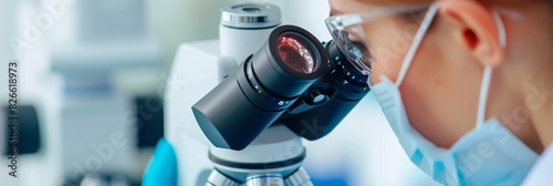 The watermark will not be included on Wall mural.: Laboratory assistant looks through a microscope studying microorganisms