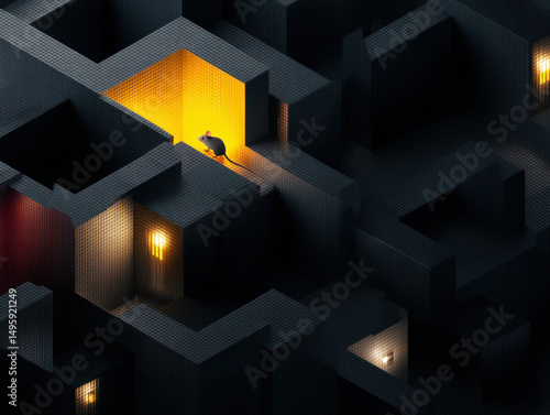 The watermark will not be included on Wall mural.: Laboratory maze with a rat navigating through tunnels
