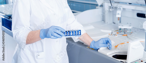 The watermark will not be included on Wall mural.: Laboratory technician sets test sample in automatic express tester