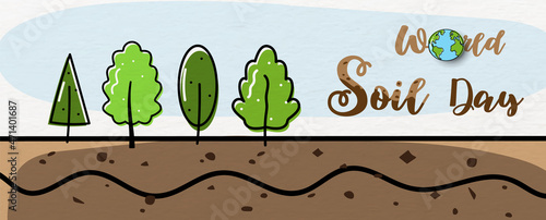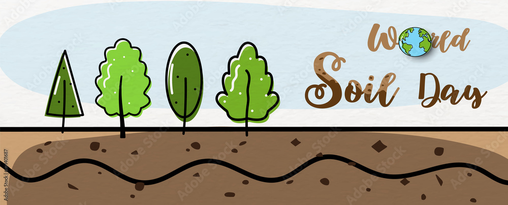 The watermark will not be included on Wall mural.: Landscape of different trees grow in ground and draw in flat style with wording design of world soil