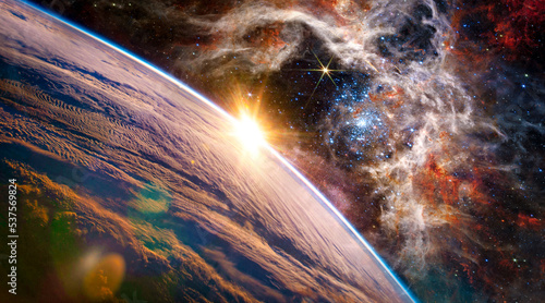 Wall mural landscape of planet, sunrise and earth view from space. (elements of this image furnished by nasa)