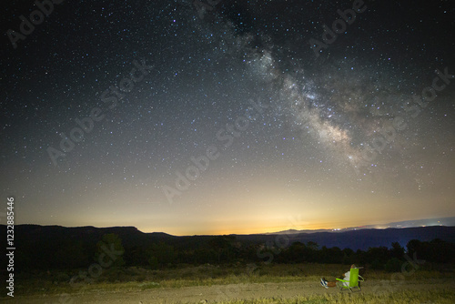 Wall mural : Landscape with blue milky way - night sky with stars at mountains, universe, beautiful mountain valle