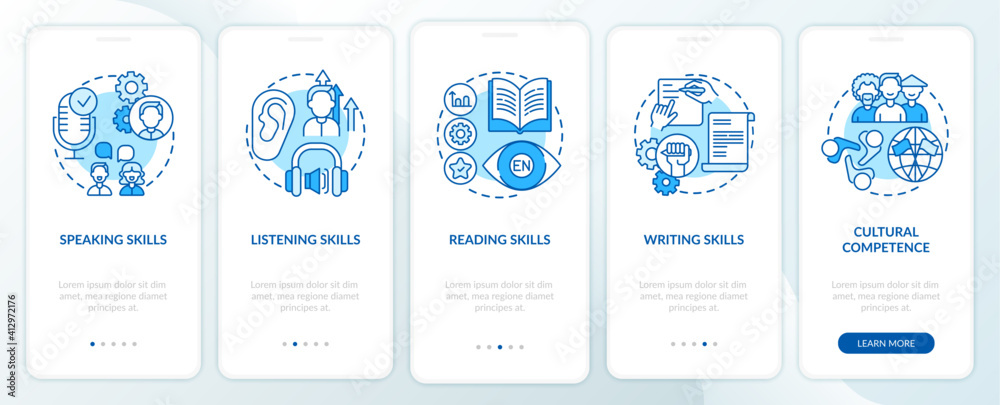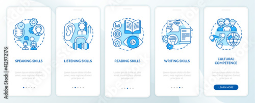 Wall mural : Language learning competencies onboarding mobile app page screen with concepts - speaking, writing sk