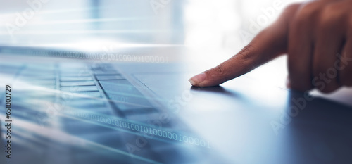 Laptop, finger and person on keyboard with light overlay for online website, data analysis and interWall mural