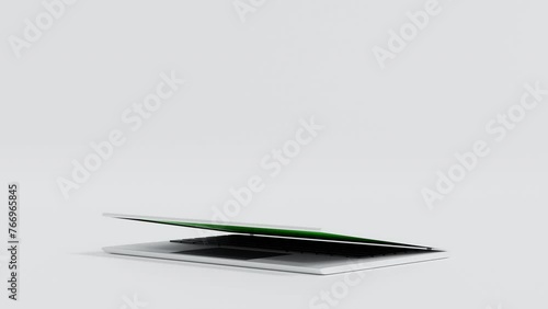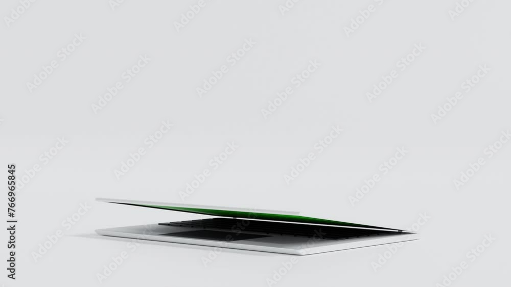 Wall mural laptop move in and open green screen display, application website presentation, 3d rendering 4k uhd. - Wall murals Wall mural laptop move in and open green screen display, application website presentation, 3d rendering 4k uhd. - Wall murals