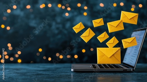 Laptop screen displaying envelope icons floating above it with blurry lights backgroundWall mural