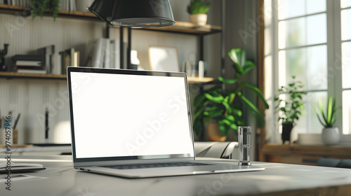 The watermark will not be included on Wall mural.: Laptop screen mockup placed on a desk, with a modern workspace setup in the background to showcase a