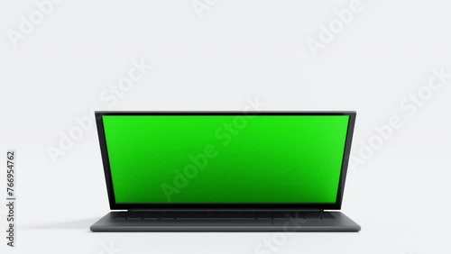 Wall mural laptop spin move in and open green screen and move out then close screen display, application websit