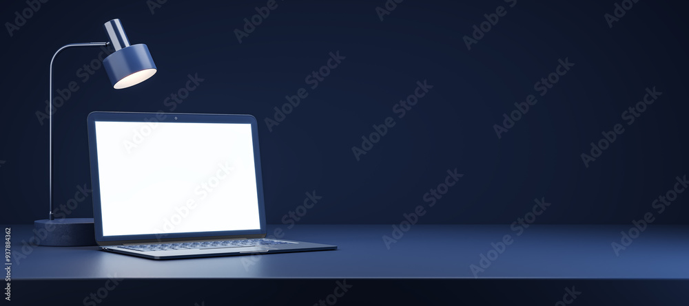 Wall mural laptop with blank screen and desk lamp on dark blue table in modern minimalistic room. 3d rendering