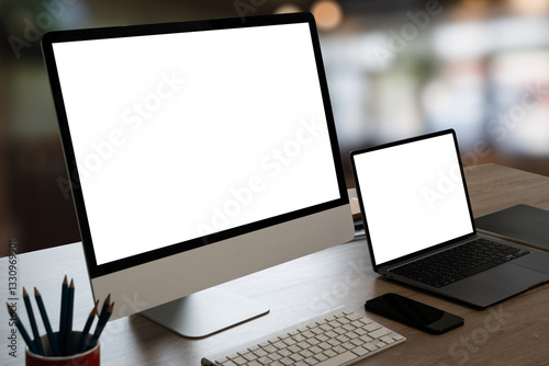 Wall mural laptop with blank screen on table. workspace background new project on laptop computer with blank co - Wall murals Wall mural laptop with blank screen on table. workspace background new project on laptop computer with blank co - Wall murals