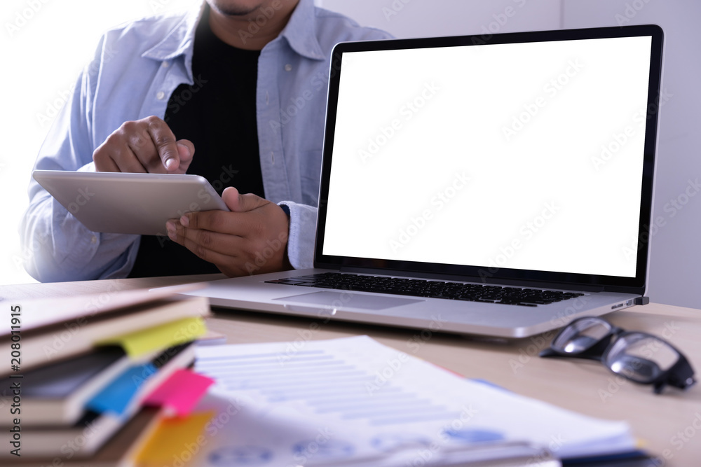 Wall mural laptop with blank screen on table. workspace background new project on laptop computer with blank co - Wall murals Wall mural laptop with blank screen on table. workspace background new project on laptop computer with blank co - Wall murals