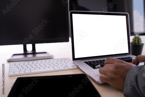 Wall mural laptop with blank screen on table. workspace background new project on laptop computer with blank co - Wall murals Wall mural laptop with blank screen on table. workspace background new project on laptop computer with blank co - Wall murals