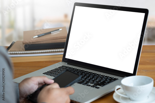 Wall mural laptop with blank screen on table. workspace background new project on laptop computer with blank co