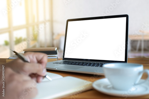 Wall mural laptop with blank screen on table. workspace background new project on laptop computer with blank co - Wall murals Wall mural laptop with blank screen on table. workspace background new project on laptop computer with blank co - Wall murals