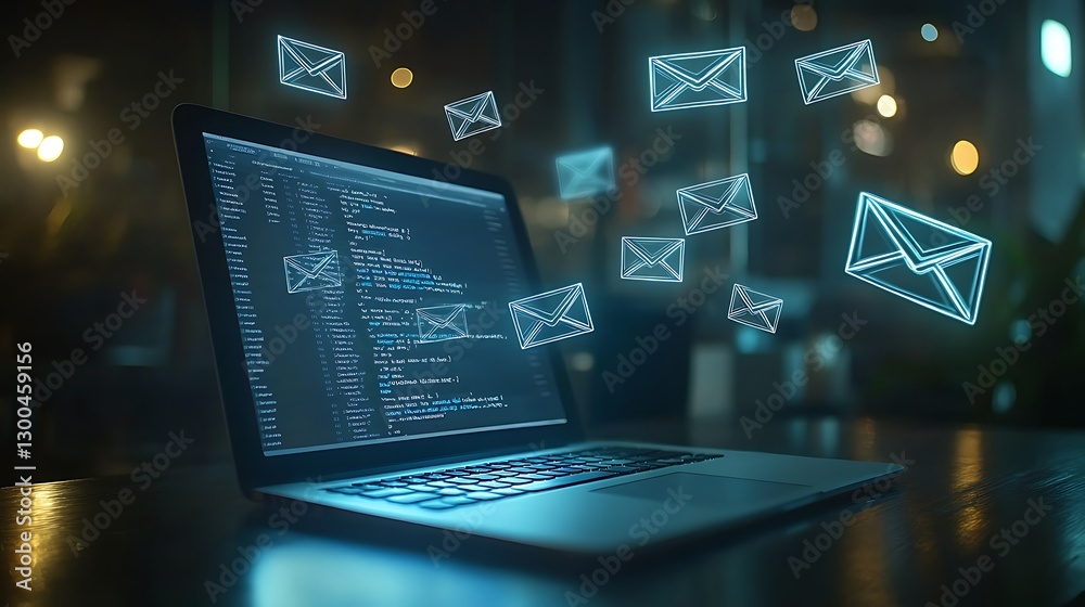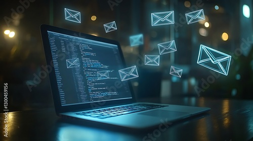 Wall mural : Laptop with code and floating email icons, a laptop displaying code with floating email icons, symbo