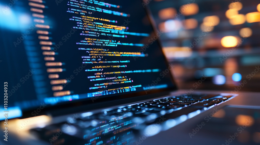 Wall mural laptop with code on screen hanging over icons programming app, software development, web coding. iso - Wall murals Wall mural laptop with code on screen hanging over icons programming app, software development, web coding. iso - Wall murals