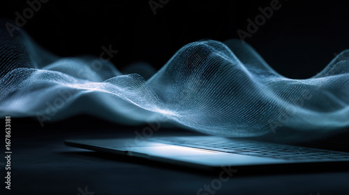 Wall mural laptop with glowing waves of digital data flowing above it creates captivating visual of technology  - Wall murals Wall mural laptop with glowing waves of digital data flowing above it creates captivating visual of technology - Wall murals