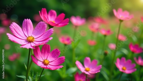The watermark will not be included on Wall mural.: Large cosmos flowers blooming in a lush green garden bed, garden, nature, blossom