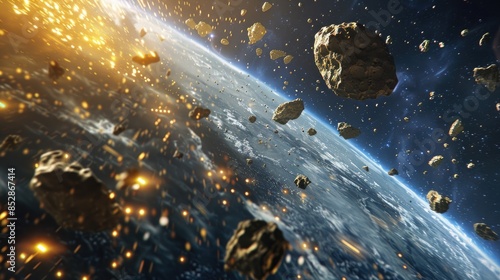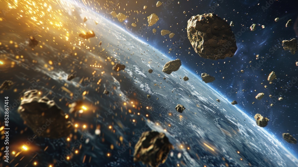 Large metallic asteroids from outer space hurtle towards the planet descending through its atmospherWall mural