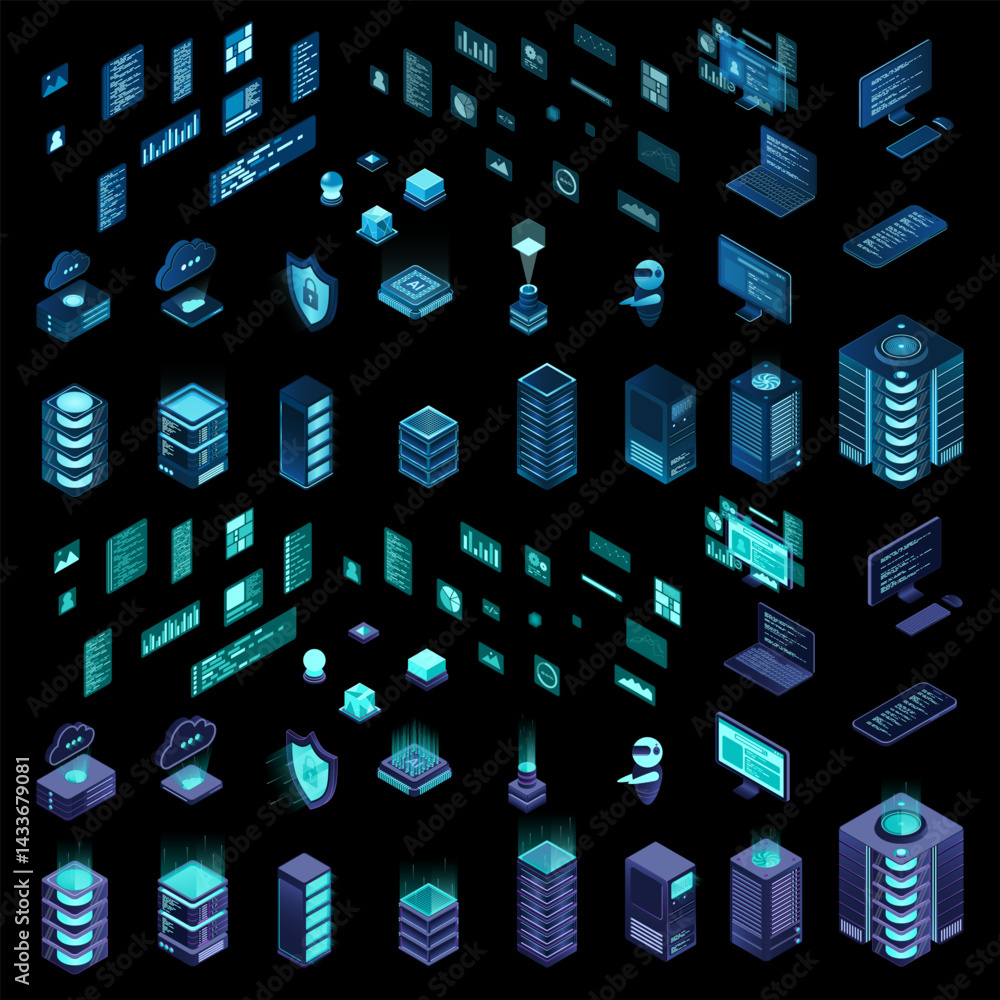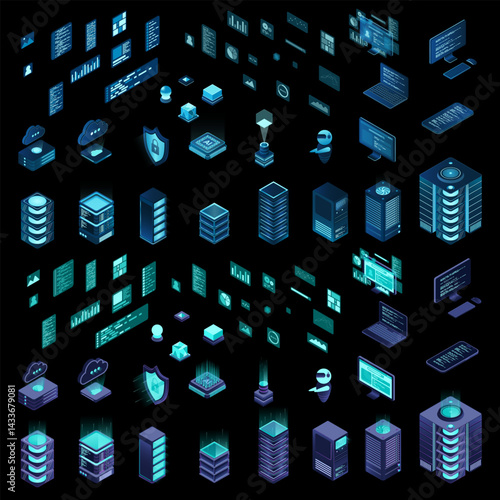 The watermark will not be included on Wall mural.: Large set of isometric computer technology - isometric set server equipment - modern technology concep