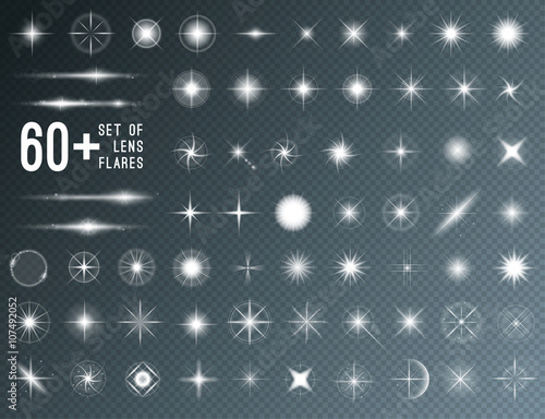 The watermark will not be included on Wall mural.: Large set of realistic lens flares star lights and glow white elements on transparent background - ve