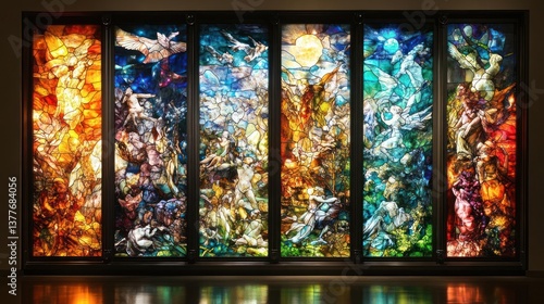 Large stained glass window depicting scenes of the cosmos and celestial beings - vivid colors and intWall mural