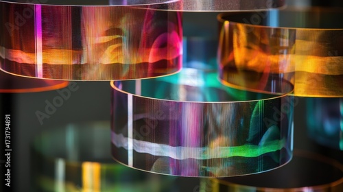 Wall mural : Laser interference rings creating vibrant rainbow diffraction patterns in transparent optical elemen