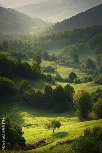 The watermark will not be included on Wall mural.: Layers of trees and green valleys generative ai