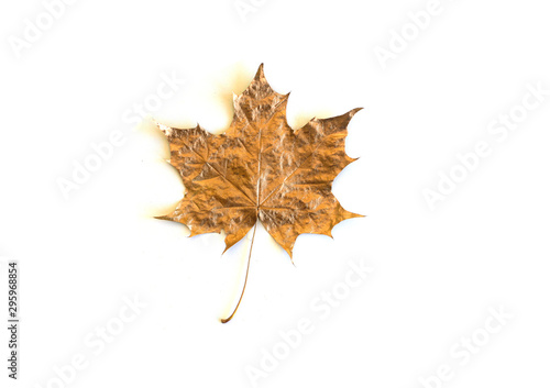 The watermark will not be included on Wall mural.: Leaf of golden trendy maple leaf isolated against white background - minimal flat lay, top view -