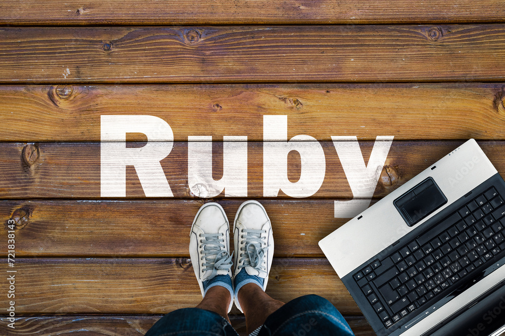 Wall mural : Legs in sneakers standing next to laptop and ruby on wooden floor - ruby programming language -