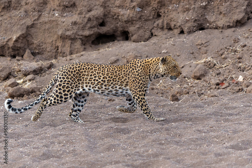 Wall mural leopard (panthera pardus) hunting in a dry riverbed in mashatu game reserve in the tuli block in bot