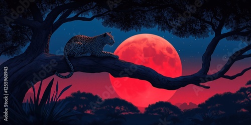 Wall mural leopard is sitting on a tree branch in front of a red moon - Wall murals Wall mural leopard is sitting on a tree branch in front of a red moon - Wall murals