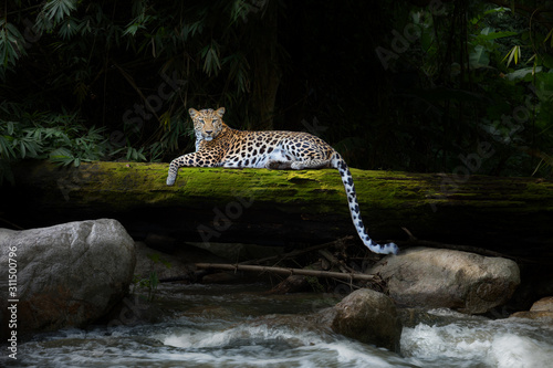 Wall mural : Leopard relax in the rain forest on the timber with moss