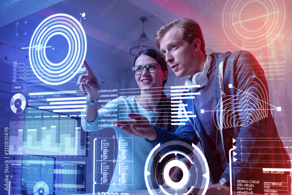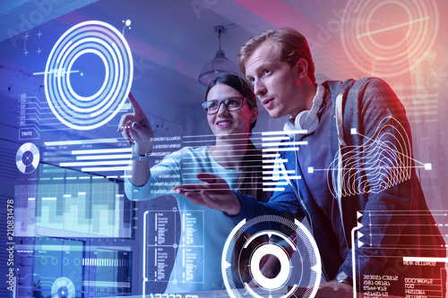 Wall mural : Lets try - positive creative colleagues looking at the information on the screen and looking interest