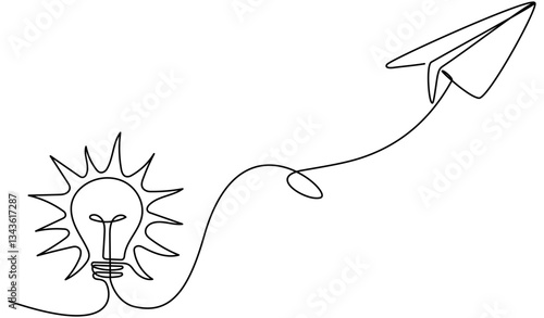The watermark will not be included on Wall mural.: Light bulb with flying paper plane continuous line drawing - idea conceptual symbol - insight concept -