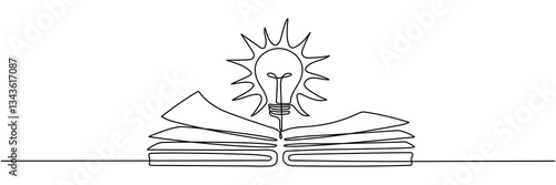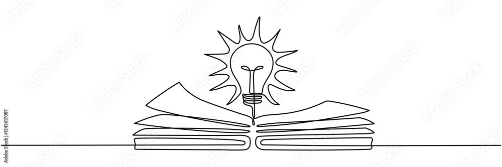 Wall mural lightbulb above open book continuous line art drawing. line idea symbol. wisdom concept. vector illu