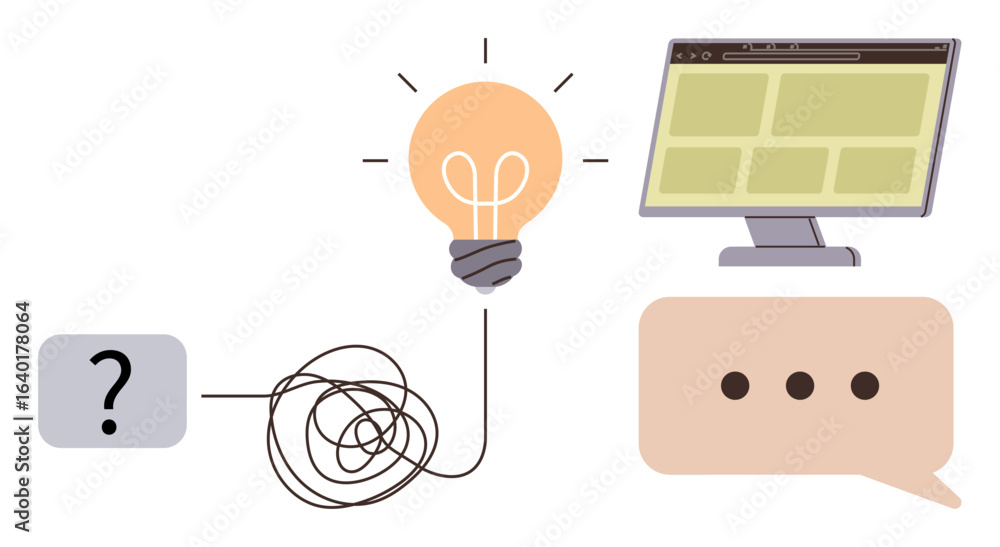 The watermark will not be included on Wall mural.: Lightbulb connected to question mark and interface via tangled line symbolizing ideas, innovation, b