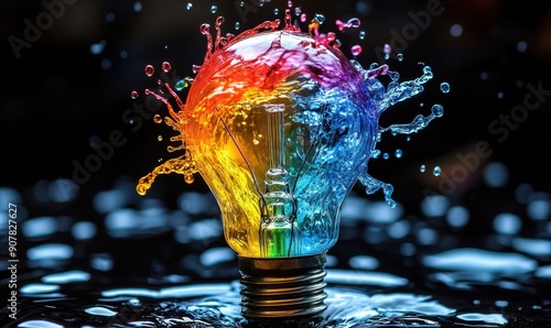 The watermark will not be included on Wall mural.: Lightbulb idea concept with colorful liquid of splashing unique creative idea on black background