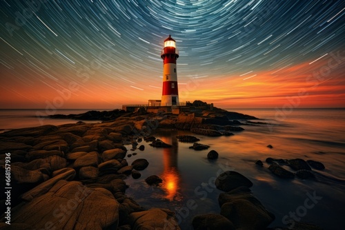 Wall mural lighthouse on the seashore. background with selective focus and copy space