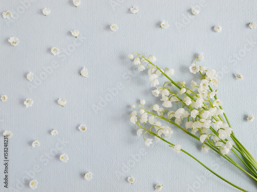 Wall mural lily of the valley on a blue paper textured background. pattern of small flowers of the may-lily. ab