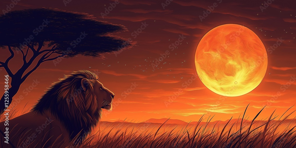 The watermark will not be included on Wall mural.: Lion is standing in front of a tree in a savanna
