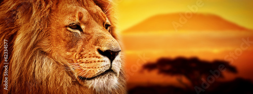 Wall mural lion portrait on savanna. mount kilimanjaro at sunset. safari - Wall murals Wall mural lion portrait on savanna. mount kilimanjaro at sunset. safari - Wall murals